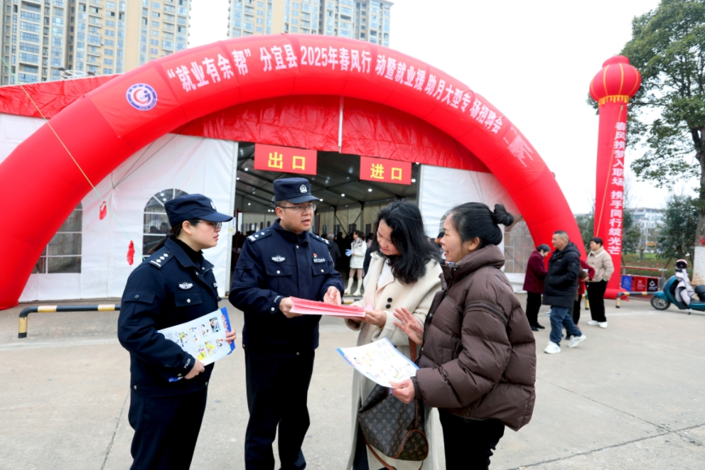 近日,江西省分宜縣公安局利用新春招聘會的有利契機,組織民輔警開展“促進就業(yè) 反詐同行”普法宣傳活動,通過發(fā)放宣傳單、案例講解、交流互動等方式,向求職的群眾講解電信網(wǎng)絡詐騙防范技巧,為應聘者上好求職防騙“第一課”。