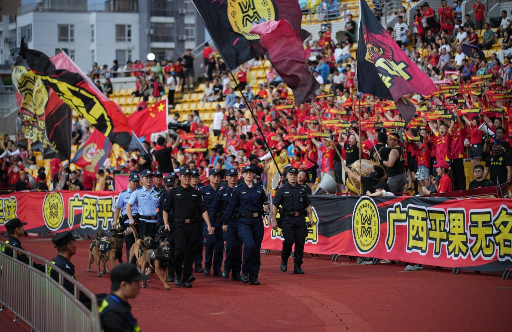 每逢平果市主場(chǎng)比賽日,各地球迷都會(huì)早早來(lái)到體育場(chǎng)外為球隊(duì)吶喊助威。而比球迷更早到達(dá)的,是平果市公安局的民輔警和安保人員?!懊繄?chǎng)比賽前,民警會(huì)提前4個(gè)小時(shí)到達(dá)現(xiàn)場(chǎng)開(kāi)展安全排爆工作。場(chǎng)內(nèi)近3萬(wàn)個(gè)座位、每一條過(guò)道、每一個(gè)看臺(tái),以及場(chǎng)外的每一個(gè)重點(diǎn)區(qū)域,我們都要認(rèn)真排查?!逼焦泄簿指本珠L(zhǎng)黃漢杰說(shuō)。