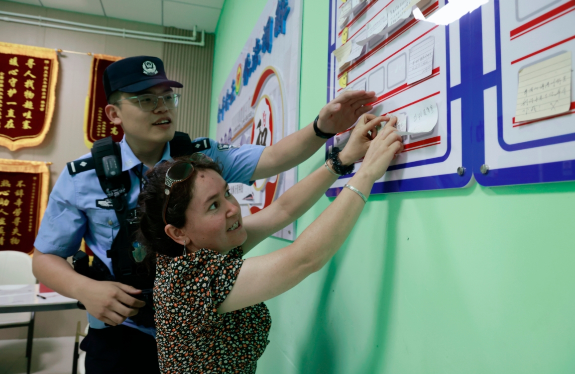 圖為受到幫助的旅客將感謝寄語貼在阿克蘇站派出所“海濤調解室”內的留言展板上。武隴慧 攝