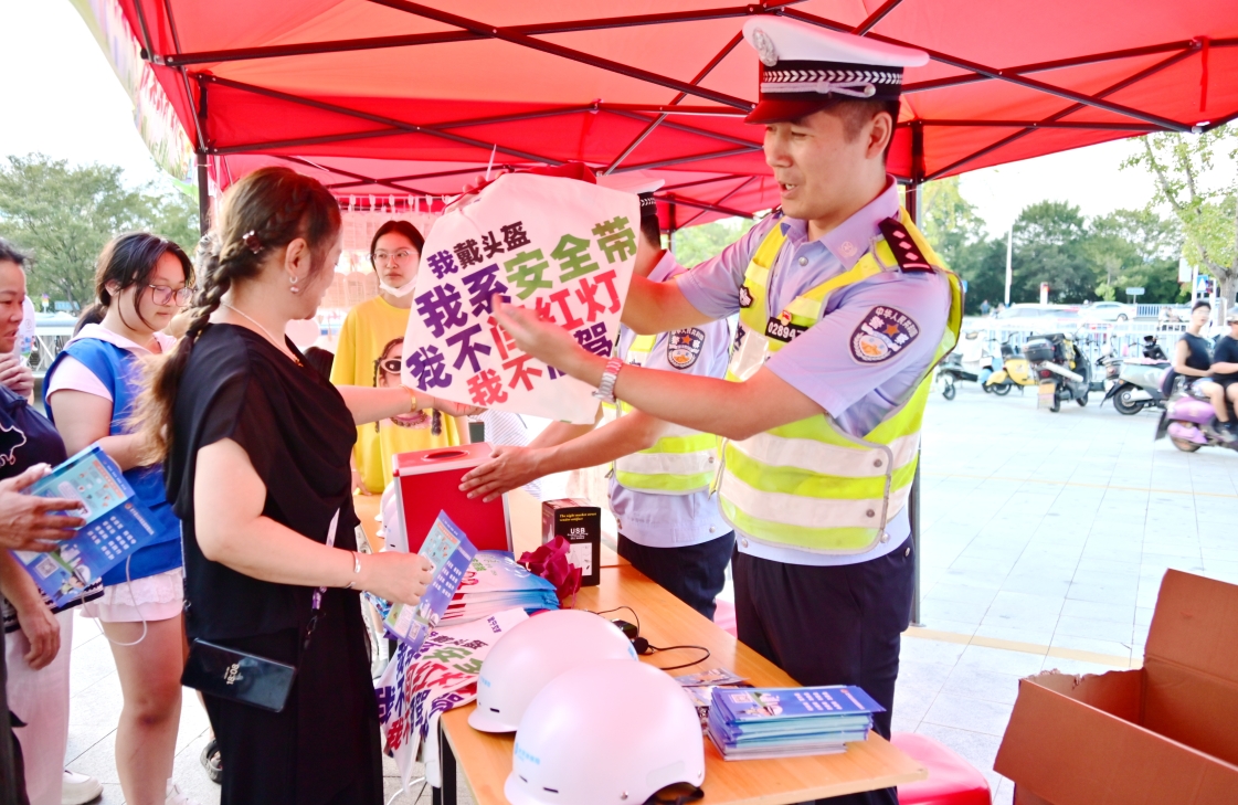 8月28日,江西省武寧縣公安局交管大隊(duì)組織民警在武寧聯(lián)盛快樂城夜市廣場(chǎng)擺攤設(shè)點(diǎn),通過以案釋法、現(xiàn)場(chǎng)答疑等方式,向群眾宣傳交通安全知識(shí),并贈(zèng)送頭盔、雨衣和圍裙等小禮品,吸引眾多市民參與。