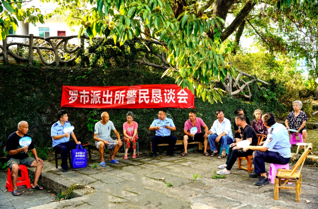 圖為奉新縣公安局羅市派出所民警在香樟樹下舉行警民懇談會(huì)。