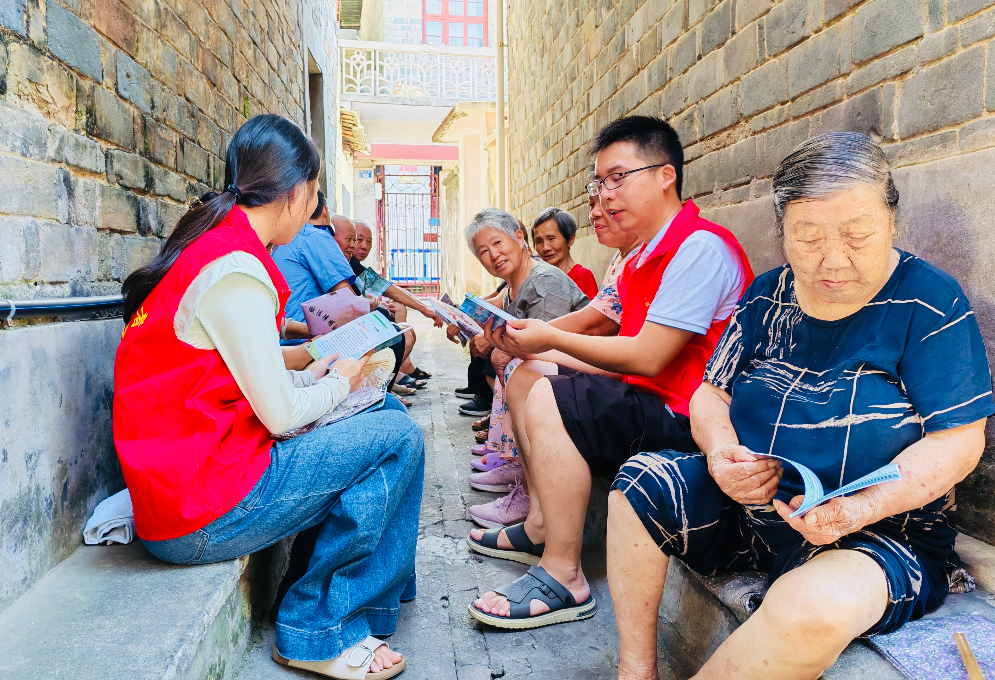 圖為普法志愿者在靖安縣南門社區(qū)巷道內(nèi)向群眾講解反詐知識。