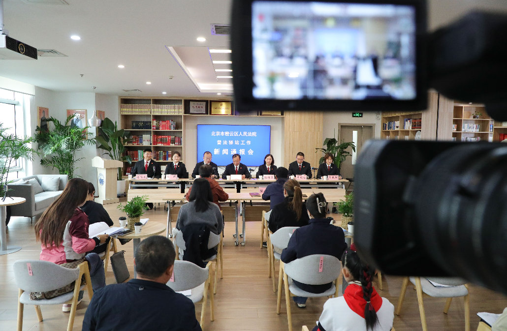 圖為密云區(qū)法院召開新聞發(fā)布會,向社會通報普法驛站建設(shè)情況。