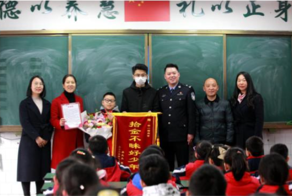 “拾金不昧好少年!”日前,四川資陽市雁江七小,失主吳先生和民警送來錦旗和《表揚信》,希望學(xué)校公開表揚該校四年級學(xué)生鐘一瑁,讓更多孩子向他學(xué)習,一樣拾金不昧。