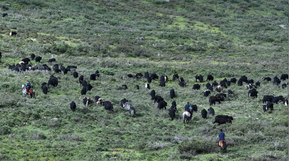 昌戈村夏季牧場(chǎng)地勢(shì)平坦,擁有豐富的水草資源,海拔高達(dá)4800米。這里,不僅是牦牛的理想棲息地,也是牧民群眾最理想的牧場(chǎng)之一。此次遷徙轉(zhuǎn)場(chǎng)中,昌戈村牧民呷波、扎西多吉等4家500多頭牦牛浩浩蕩蕩“組團(tuán)”前行。