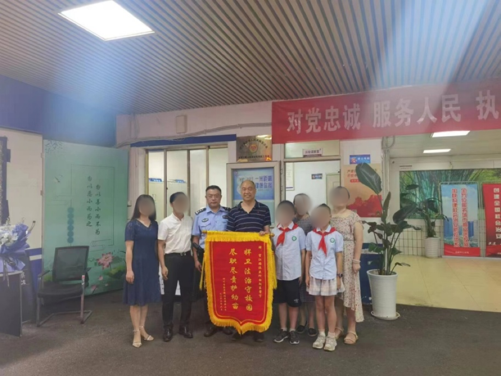 老師和孩子們給白警官送上寫著“捍衛(wèi)法制守校園、盡職盡責(zé)護(hù)幼苗”的錦旗,感謝他與派出所其他民警幾十年如一日細(xì)致入微的護(hù)校安園工作,確保了學(xué)校師生的安全。