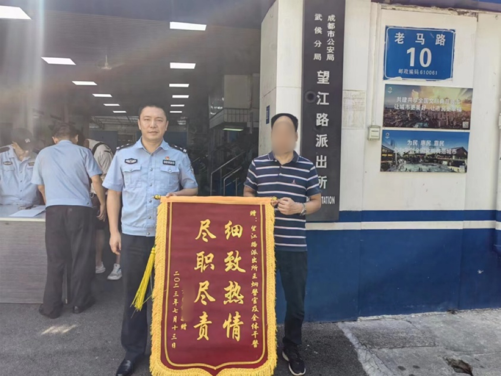 “謝謝警察同志,這么快就幫我把手機(jī)找回來了!”近日,方先生將一面印有“細(xì)致熱情 盡職盡責(zé)”的錦旗送到了望江路派出所教導(dǎo)員彭偉手中,對派出所民警快速為其追回手機(jī)表示誠摯感謝。