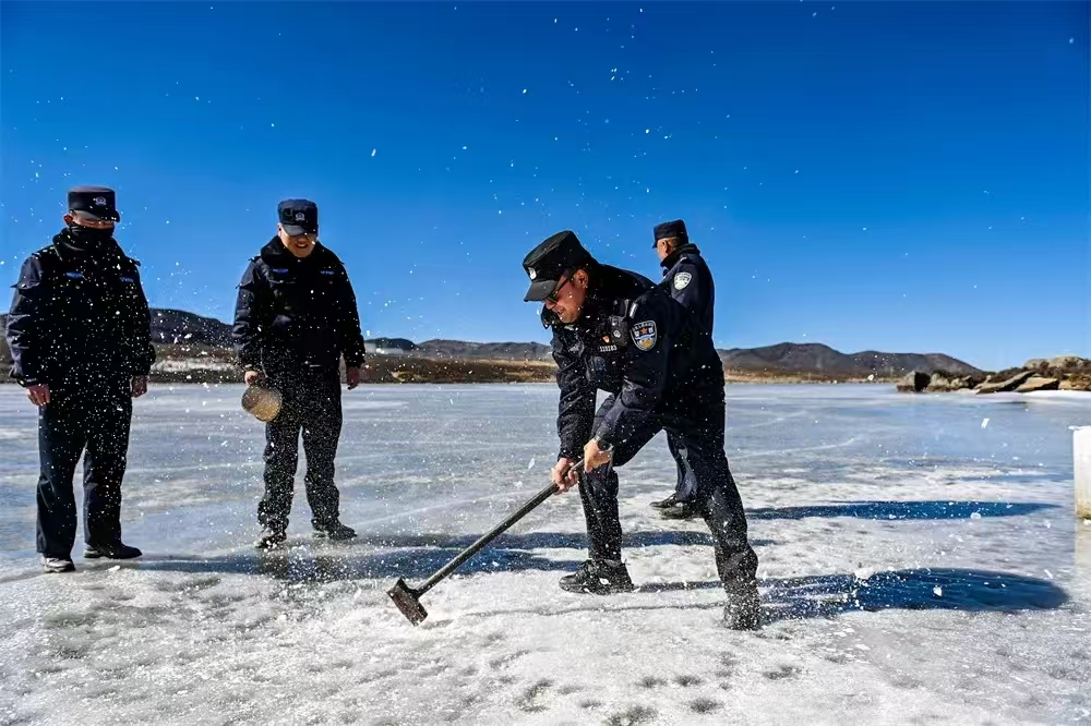 中午時(shí)分,土登郎加又和大家一起前往警務(wù)站不遠(yuǎn)處的措拉湖里取水,警務(wù)站不通水,大家的生活用水都是從這個(gè)海子里提取的。每到冬季,海子的水面就會(huì)結(jié)冰,堅(jiān)固的冰面能夠通行汽車。只有到了中午,氣溫開始回升,冰層融化了一些,大家找到結(jié)冰薄一點(diǎn)的地方,使勁用鐵錘鑿開一個(gè)窟窿,才能取到冰面下的水。