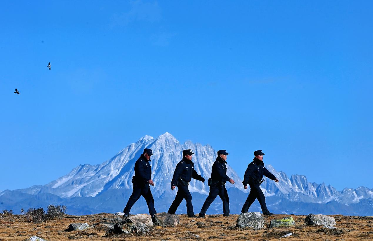 12月18日清晨,氣溫只有零下8攝氏度,警務(wù)站副站長(zhǎng)土登郎加帶領(lǐng)著輔警扎西澤仁、仁青、斯郎多吉開始了一天的例行巡邏。湛藍(lán)的天空下,遠(yuǎn)方的雅拉雪山巍峨聳立,雄鷹在空中展翅翱翔,在他們的腳下,是亞洲迄今探明的最大規(guī)模硬巖型單體鋰礦礦區(qū)。