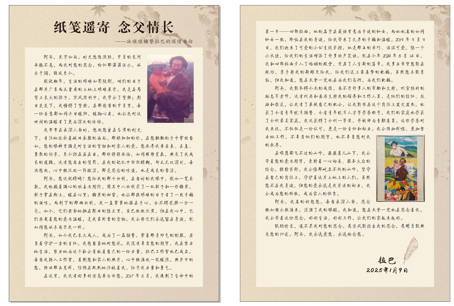 “阿爸,見字如面。時(shí)光悠悠流轉(zhuǎn),歲月的長(zhǎng)河奔騰不息,而我對(duì)您的思念,恰似那潺潺溪水,從未干涸,綿延至今。我常常在夜深人靜時(shí),想起您坐在昏黃的燈光下,專注地縫補(bǔ)著破舊衣服的畫面。那根細(xì)細(xì)的針,在您粗糙的手中穿梭自如,您的眼神里滿是對(duì)生活的堅(jiān)韌和對(duì)家人的愛。您教導(dǎo)我要善良、正直、勇敢的場(chǎng)景,至今仍歷歷在目。那些諄諄教誨,如同璀璨星辰,照亮了我成長(zhǎng)的道路。阿爸,您還記得嗎?您給我的那十塊錢,在當(dāng)時(shí)的我眼中,猶如一筆巨款。我懷揣著滿心的歡喜與期待,用其中八塊錢買了一雙鞋子和一些糖果。鞋子穿在腳上,暖在心里;糖果的甜蜜,也讓那段艱難的日子有了一絲幸福的滋味。而剩下的那兩塊錢,我一直緊緊地攥在手心,舍不得花掉一分一毫。如今,它們安靜地躺在陳舊的像夾里,雖已微微泛黃,但在我心中,它們承載著您的愛與溫暖,是我最珍貴的寶物。我會(huì)將它們永遠(yuǎn)留在身邊,就如同您從未離開我一樣。在這里,我還有好多好消息要告訴您。2017年6月,我遇到了生命中的另一半——四郎拉西。她的名字在藏語(yǔ)里意為幸運(yùn)的仙女,而她也真的如同仙女一般,降臨在我的身邊,給我?guī)砹藷o盡的幸福和溫暖。2019年9月9日,我們迎來了可愛的小公主俄薩措,她是那么的乖巧、活潑可愛,像一個(gè)小天使,給我們的生活增添了許多歡聲笑語(yǔ)。在雄鷹都飛不過的山峰,巍巍雀兒山下,我會(huì)帶著您的愛與期望,秉持著一心向善、服務(wù)大眾的信念,繼續(xù)前行。我會(huì)像那屹立不倒的山峰,堅(jiān)守在自己的崗位上,守護(hù)著這片土地上的人們。雖然您不在我身邊,但您的愛永遠(yuǎn)是我前進(jìn)的動(dòng)力,我會(huì)成為您的驕傲,成為家人的依靠?!边@是一封來自德格縣的輔警拉巴寫給父親的信,信件以樸素的詞匯表達(dá)了對(duì)已故父親的思念,以及自己將謹(jǐn)遵父親教誨,努力在崗位上發(fā)光發(fā)熱的決心。