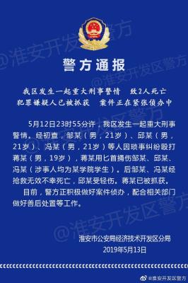 法制網(wǎng)訊 記者羅莎莎 @淮安開發(fā)區(qū)警方官方微博5月13日發(fā)布通報(bào),5月12日23時(shí)55分許,該區(qū)發(fā)生一起重大刑事警情。經(jīng)初查,鄒某(男,21歲)、邱某(男21歲)、馮某(男,21歲)等人因瑣事糾紛毆打蔣某(男,19歲),蔣某用匕首捅傷鄒某、邱某、馮某(涉事人均為某學(xué)院學(xué)生)。后鄒某、馮某經(jīng)搶救無效不幸死亡,邱某受輕傷。目前,蔣某已被抓獲,警方正積極做好案件偵辦,配合相關(guān)部門做好善后處置等工作。