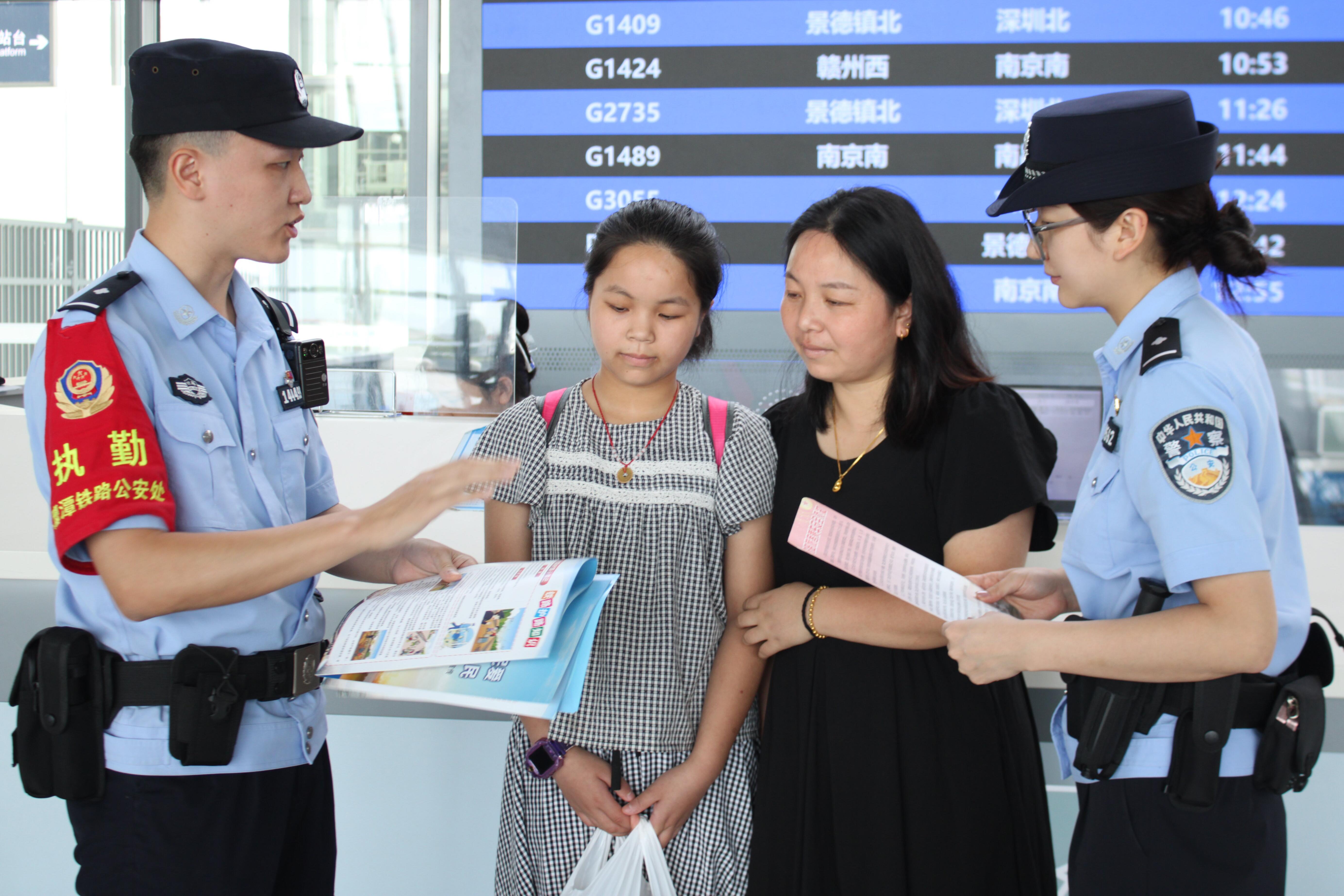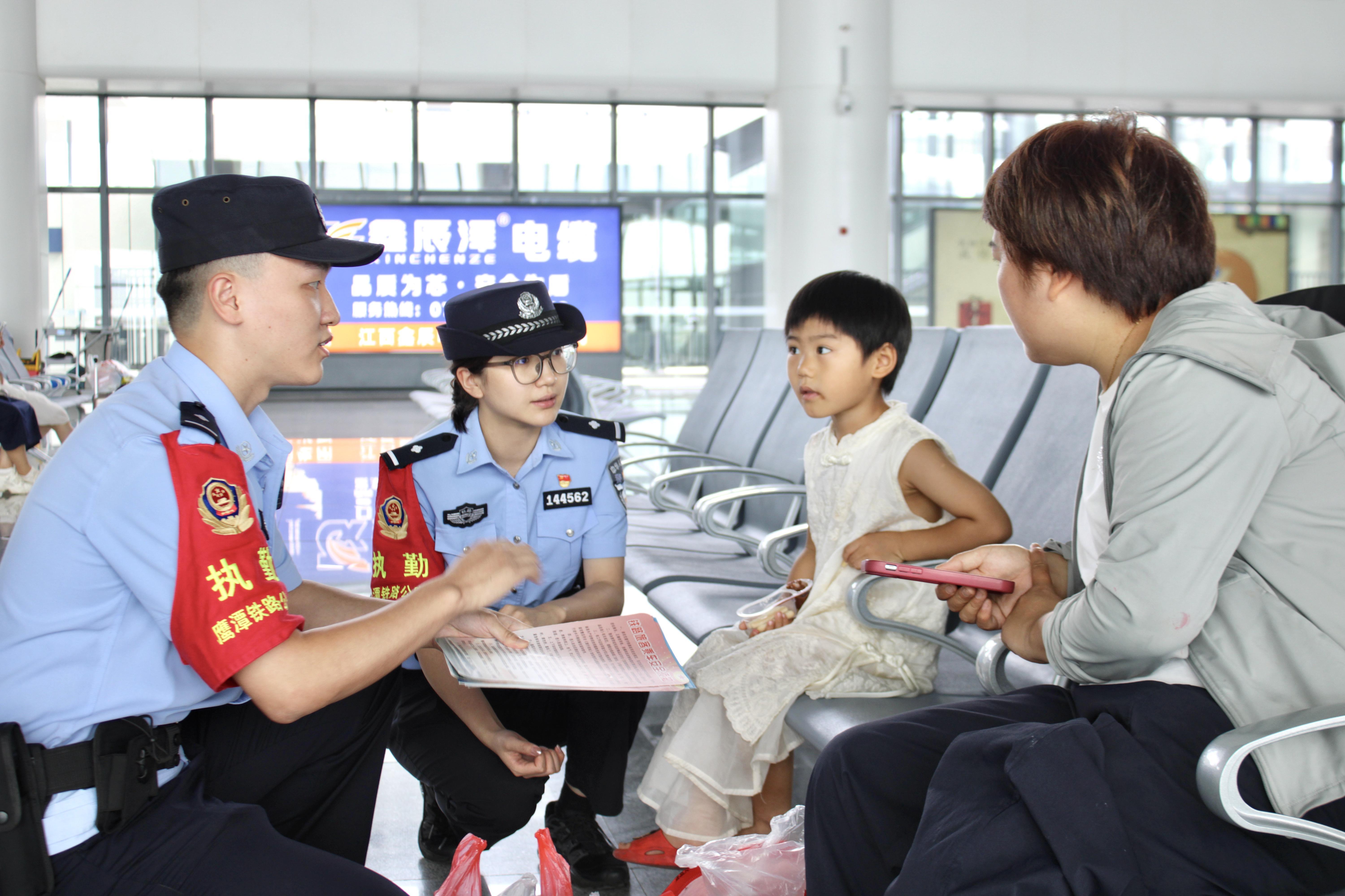 暑運期間,南昌鐵路公安局組織警力深入轄區(qū)車站及鐵路沿線,圍繞防猥褻、防盜竊、防拐騙、防詐騙等向出行旅客普及安全知識,全力保障旅客平安出行。圖為7月23日,南昌鐵路公安局鷹潭公安處余干站派出所民警在候車室向旅客普及反詐知識。