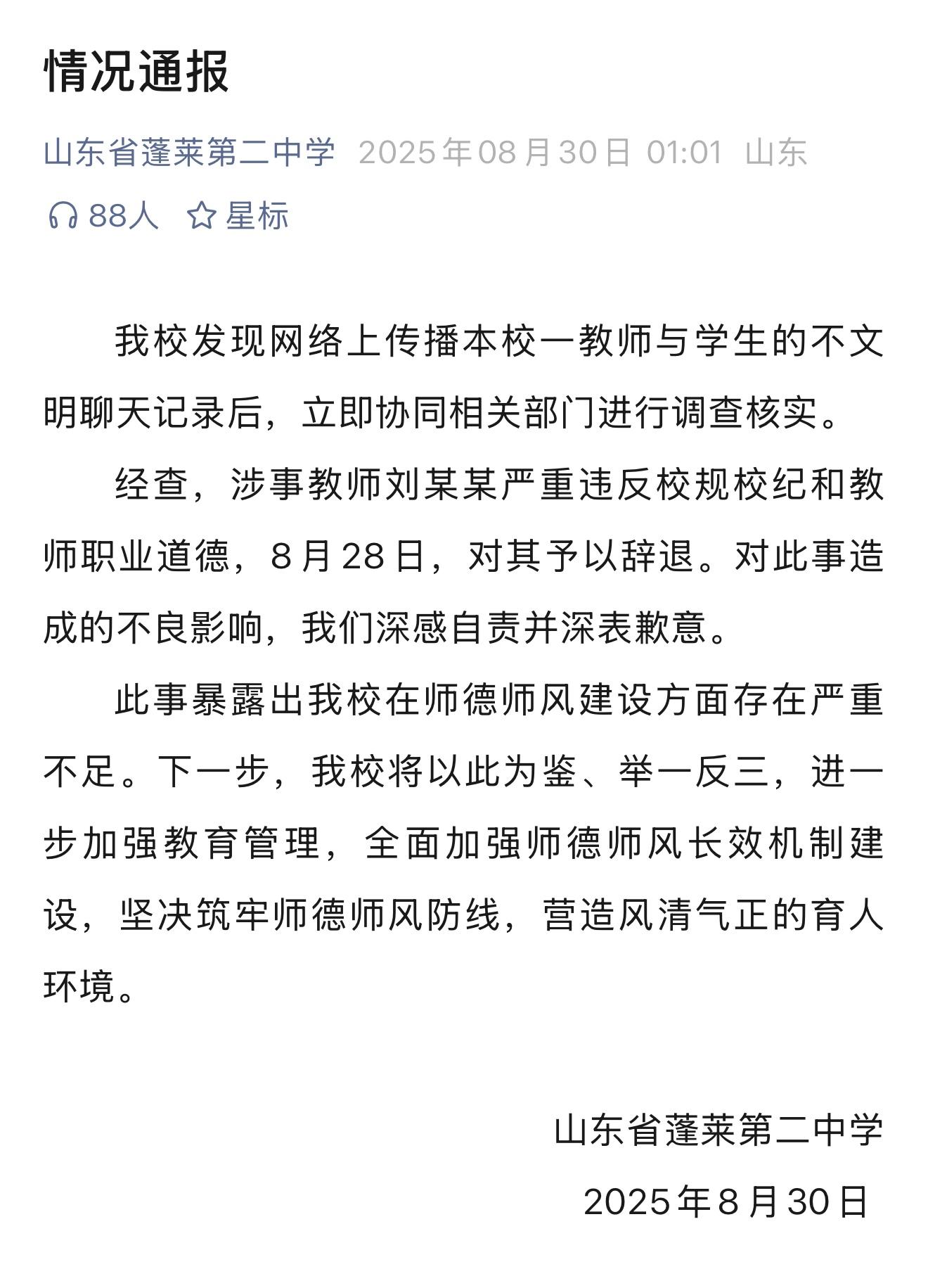 8月30日1點1分,山東省煙臺市蓬萊第二中學(xué)通過官方微信公眾號發(fā)布情況通報,對網(wǎng)傳“教師與學(xué)生不文明聊天記錄”事件進行回應(yīng),通報原文如下: