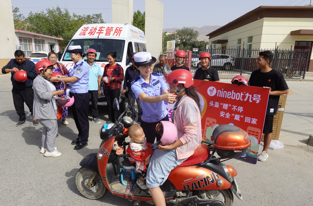 為從源頭上消除交通安全隱患,全力確保騎乘電動自行車、摩托車的群眾佩戴國家標準安全頭盔,9月11日,新疆庫爾勒市公安局交通管理大隊車輛管理所民輔警聯(lián)合體檢中心的醫(yī)務工作者、電動自行車企業(yè)相關人員,通過“警醫(yī)企”聯(lián)動,采取“上門服務+交通宣傳”的形式,將“流動車管所”開到鄉(xiāng)村,深入街頭巷尾開展“頭盔‘贈’不停 安全‘戴’回家”車駕管業(yè)務和交通安全主題宣傳活動,并向群眾贈送帶有3C認證的國家標準安全頭盔。