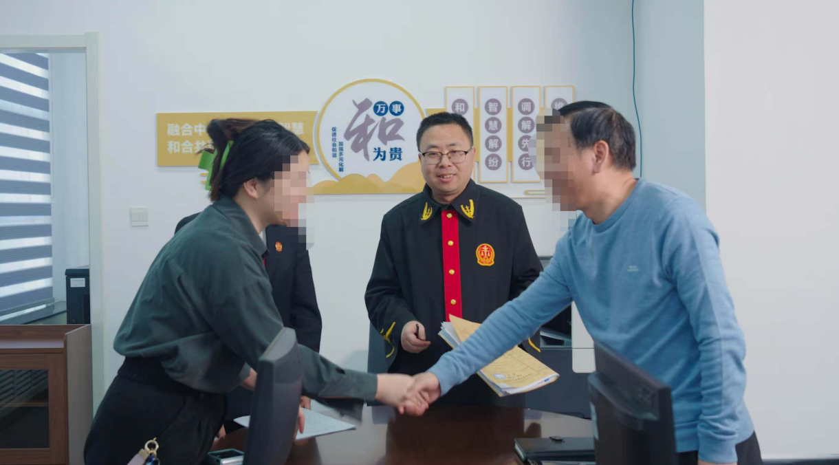 圖為中國(新疆)自由貿(mào)易試驗(yàn)區(qū)烏魯木齊片區(qū)法庭化解一起買賣合同糾紛,當(dāng)事人雙方握手言和。通訊員 王雅楠 攝