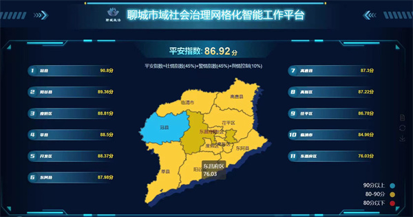 試點工作中,聊城市運用市域社會治理智能化平臺助力深化平安建設(shè),在平臺定期生成全市“平安指數(shù)”,涵蓋各縣區(qū)社會治安、道路交通、安全生產(chǎn)等10項指標(biāo),引導(dǎo)精準(zhǔn)查找、整改短板問題。針對重大活動,發(fā)揮平臺研判決策、指揮調(diào)度功能,對問題及時發(fā)現(xiàn)處置,助力工作嚴(yán)格落實。