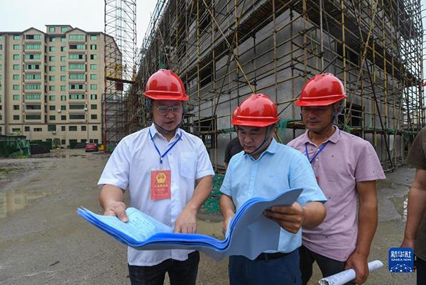 在浙江省湖州市吳興區(qū)東林鎮(zhèn)星火村,當(dāng)?shù)厝舜蟠砑按迕翊韺π腔鸫遛r(nóng)民新村建設(shè)項目的施工進(jìn)展情況進(jìn)行監(jiān)督檢查(2021年6月2日攝)。新華社記者 徐昱 攝