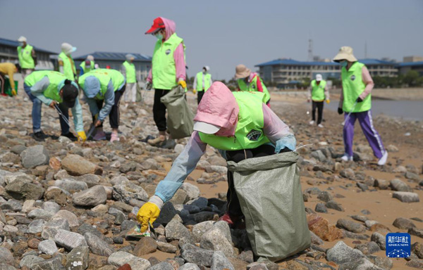 2022年6月8日,志愿者在江蘇連云港海州灣國(guó)家級(jí)海洋公園清理海灘上的垃圾。新華社發(fā)(王健民?攝)