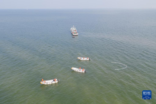 2021年8月9日,河北省黃驊市海上環(huán)衛(wèi)船只在渤海海域打撈海漂垃圾(無(wú)人機(jī)照片)。新華社記者?駱學(xué)峰?攝