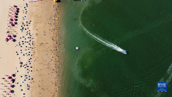 2021年6月5日,游客在天津市濱海新區(qū)東疆港人工沙灘游玩(無(wú)人機(jī)照片)。近年來(lái),天津堅(jiān)持渤海治污與岸線治理相結(jié)合,啟動(dòng)岸線和濱海濕地整治、修復(fù)等項(xiàng)目。新華社記者?趙子碩?攝