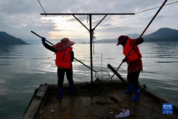 2021年6月1日,環(huán)衛(wèi)工人在三都澳海域打撈海漂垃圾。近年來(lái),福建省寧德市加強(qiáng)海漂垃圾綜合整治工作,成立專業(yè)海上環(huán)衛(wèi)公司,清理轉(zhuǎn)運(yùn)海岸線附近海域的海漂垃圾,保護(hù)海洋環(huán)境。新華社記者?姜克紅?攝