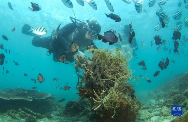 2021年9月14日,在海南三亞蜈支洲島海域,工作人員在海底清理纏繞在珊瑚上的漁網(wǎng)和繩子。新華社記者?楊冠宇?攝