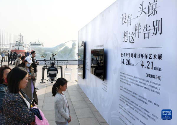 2022年4月20日,游客在山東青島奧林匹克帆船中心觀看“沒(méi)有一頭鯨想這樣告別”環(huán)保藝術(shù)展介紹。展覽旨在倡導(dǎo)人們愛護(hù)海洋動(dòng)物、認(rèn)識(shí)海洋垃圾的危害、提高海洋生態(tài)保護(hù)意識(shí)。新華社記者?李紫恒?攝