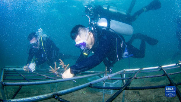 2022年6月7日,在海南省陵水黎族自治縣分界洲島附近海域,海南省海洋與漁業(yè)科學(xué)研究院的專家和分界洲島旅游區(qū)工作人員在移植珊瑚,努力保護(hù)海域的珊瑚礁生態(tài)系統(tǒng)。新華社記者?張麗蕓?攝