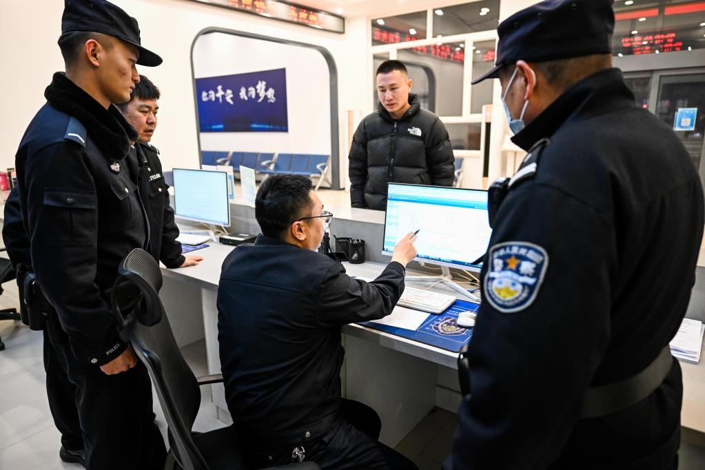 2月5日,通遼市奈曼旗公安局大沁他拉派出所民警們?cè)诰C合指揮室值班。