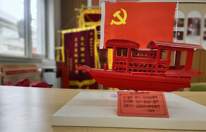 這艘紅船模型出自社區(qū)居民齊大爺之手。
