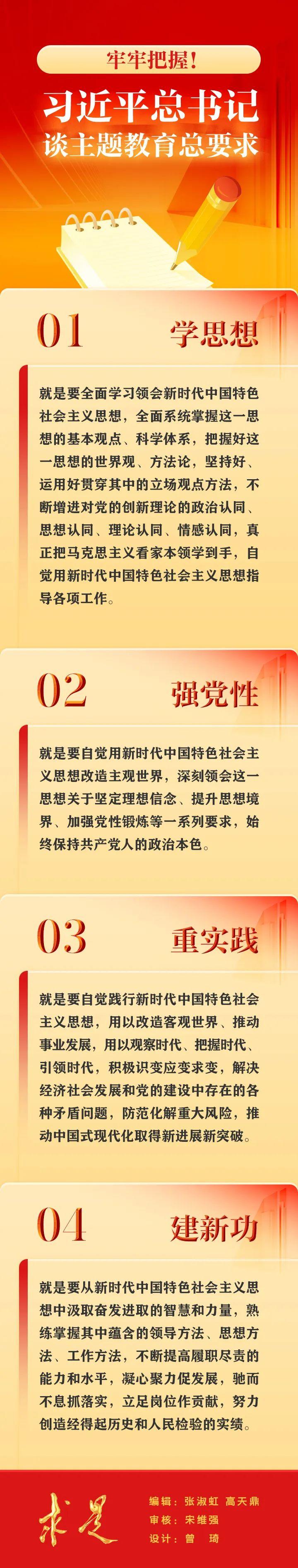 在2023年第9期《求是》雜志刊發(fā)的習(xí)近平總書記重要文章《在學(xué)習(xí)貫徹習(xí)近平新時(shí)代中國(guó)特色社會(huì)主義思想主題教育工作會(huì)議上的講話》中,總書記強(qiáng)調(diào)要“牢牢把握總要求”,“把這一總要求貫穿這次主題教育全過程”。