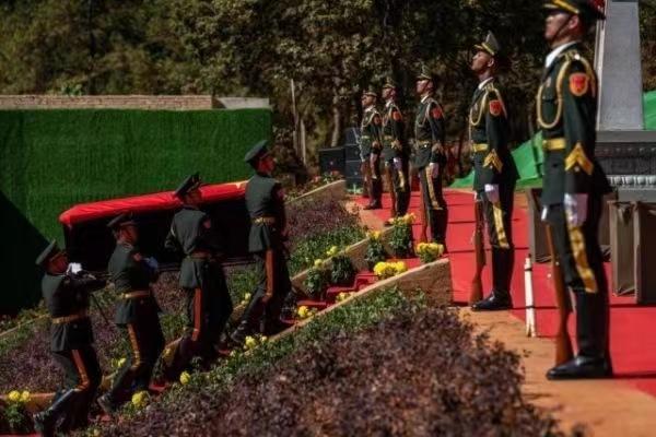 烈士陵園里,高聳的紀(jì)念碑引人注目。隨著烈士棺槨輕輕安放入墓,全體人員向烈士三鞠躬。隨后,現(xiàn)場的人們依次向烈士獻(xiàn)花致敬。