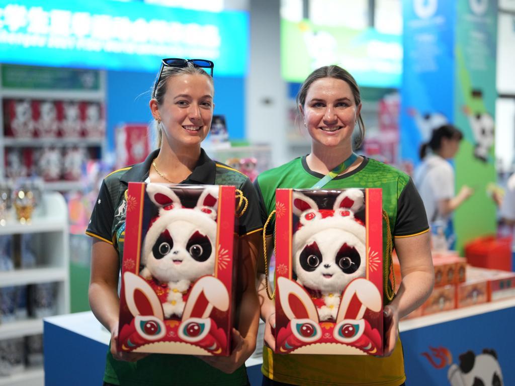 蘇珊(左)和隊(duì)友展示剛剛買(mǎi)到的兔年版“蓉寶”。新華社記者 鄭直 攝