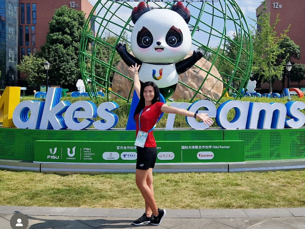 卡米拉·娜普洛斯塞克在成都大運(yùn)村“蓉寶”雕塑前留影。圖片來(lái)自選手個(gè)人社交媒體頁(yè)面
