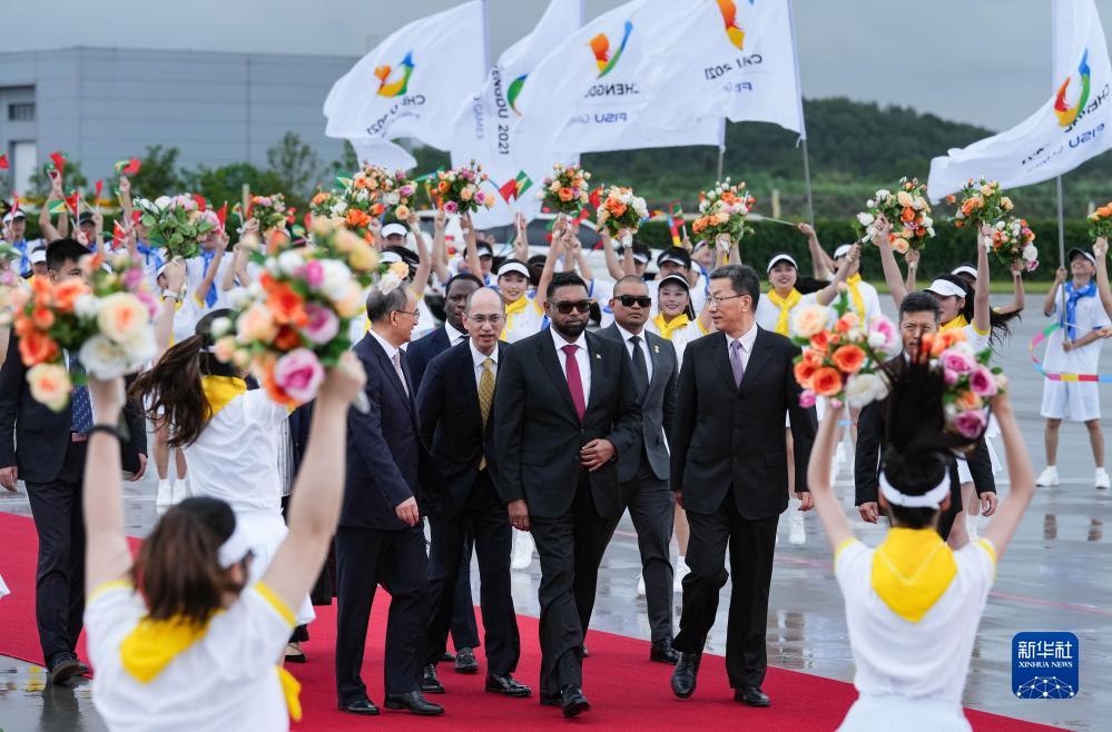7月27日下午,來(lái)華出席成都大運(yùn)會(huì)開(kāi)幕式并訪(fǎng)問(wèn)的圭亞那總統(tǒng)阿里抵達(dá)四川省成都市。