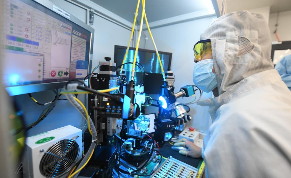 武漢光迅科技股份有限公司生產(chǎn)車間內(nèi),技術人員在光模塊生產(chǎn)線作業(yè)。新華社記者程敏 攝