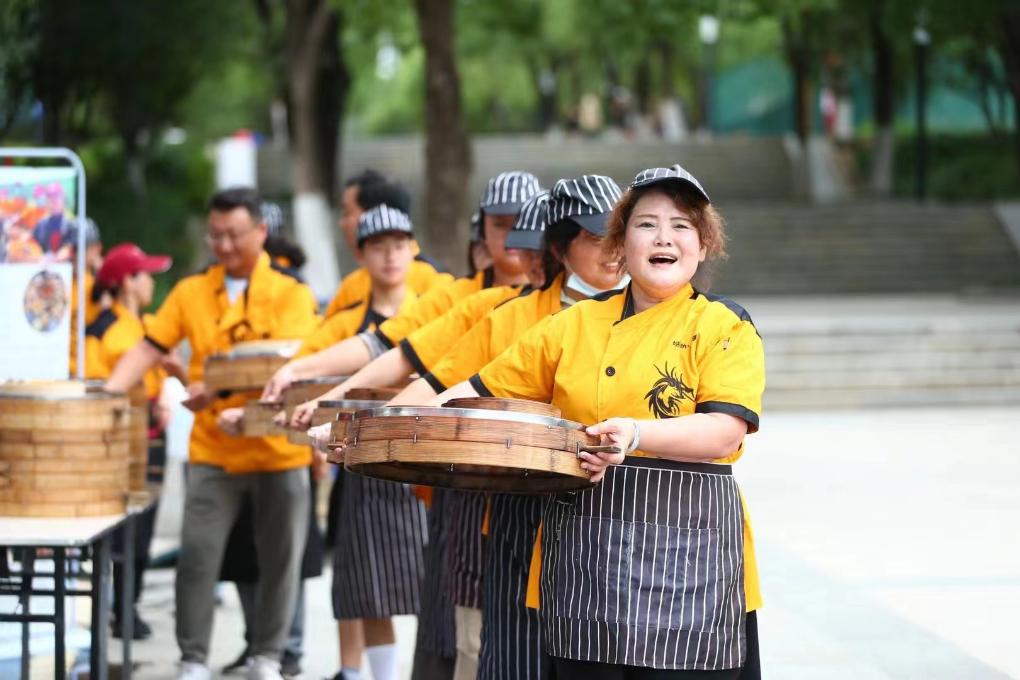 湖北省京山市的特色蒸籠宴“搬”到了網(wǎng)球場。(高寶 攝)