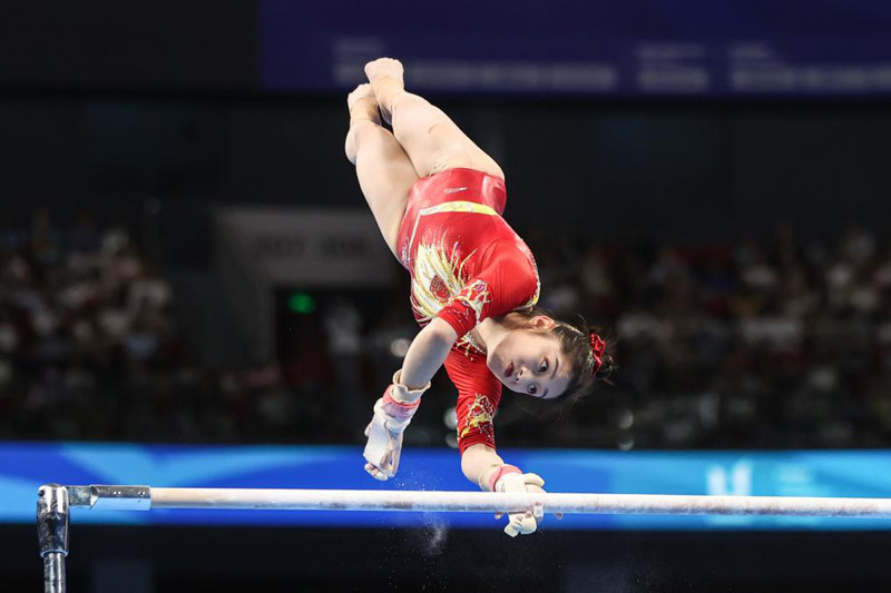 8月3日,中國隊選手韋筱圓在高低杠比賽中。新華社記者 張麗蕓 攝