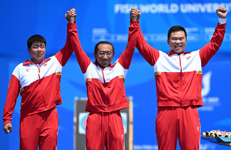7月30日,中國(guó)隊(duì)選手陳巖松、杜美余、王世坤(從左至右)在頒獎(jiǎng)儀式上。當(dāng)日,在成都舉行的第31屆世界大學(xué)生夏季運(yùn)動(dòng)會(huì)男子復(fù)合弓團(tuán)體金牌賽中,中國(guó)隊(duì)以231環(huán):224環(huán)戰(zhàn)勝法國(guó)隊(duì),獲得冠軍。新華社記者 張龍 攝