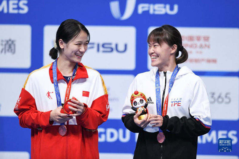 8月7日,季軍中國(guó)臺(tái)北選手許玟琪(右)和中國(guó)選手張藝曼在頒獎(jiǎng)儀式上。新華社記者 張端 攝