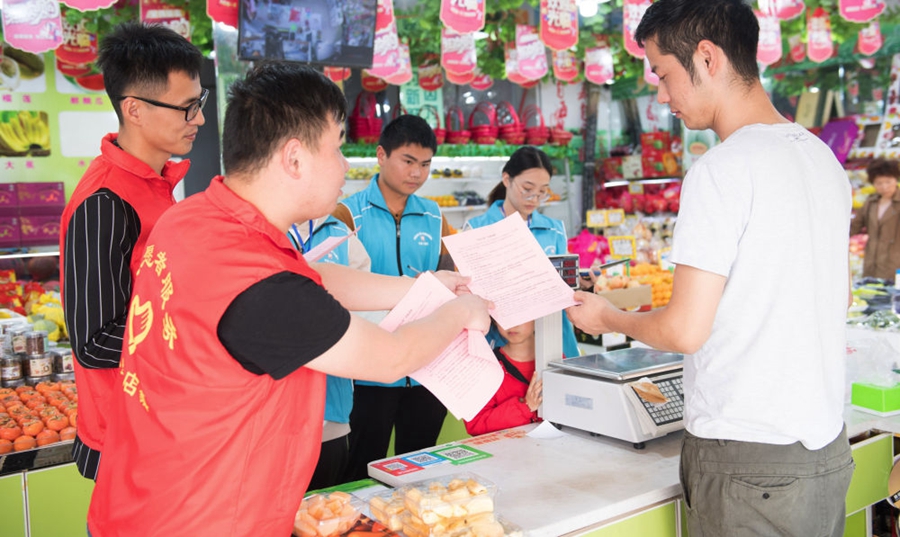 浙江省湖州市吳興區(qū)八里店鎮(zhèn)結(jié)合主題教育和“三服務(wù)”,推進(jìn)“民生大走訪(fǎng)”工作機(jī)制,全體網(wǎng)格員下沉村、社一線(xiàn),了解社情民意,化解矛盾糾紛,服務(wù)村社群眾。這是八里店鎮(zhèn)中心片區(qū)網(wǎng)格員(藍(lán)衣者)和志愿者(紅衣者)對(duì)一家店鋪進(jìn)行平安問(wèn)卷調(diào)查(2019年10月31日攝)。新華社記者 翁忻旸 攝