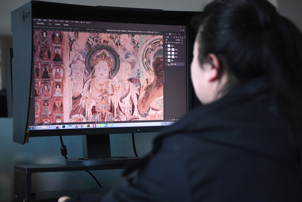 敦煌研究院文物數(shù)字化保護(hù)團(tuán)隊(duì)圖像處理人員年海麗在拼接壁畫(huà)圖像(2023年4月25日攝)。數(shù)字化探索為莫高窟的保護(hù)與傳承開(kāi)辟了全新路徑,數(shù)字技術(shù)讓敦煌文物走出洞窟,跨出國(guó)門,走向“永久保存、永續(xù)利用”。新華社記者 陳斌 攝