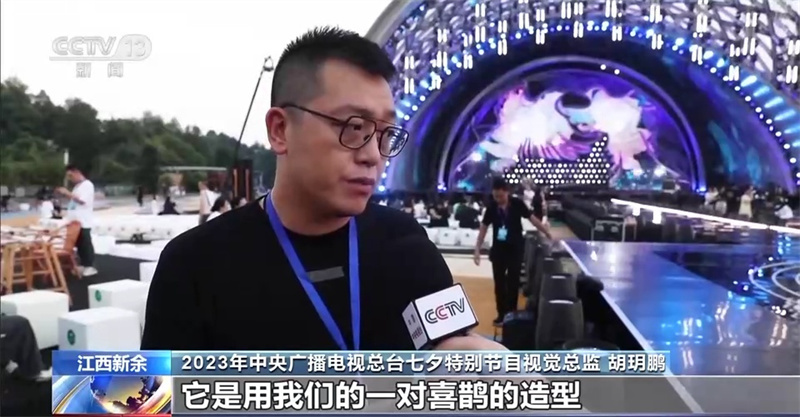 2023年中央廣播電視總臺七夕特別節(jié)目視覺總監(jiān) 胡玥鵬:整個主舞臺的LED屏,用一對喜鵲的造型來作為主造型,每個節(jié)目都要依據(jù)我們現(xiàn)在舞美的造型來做設(shè)計。同時我們設(shè)計了一個新媒體互動裝置的樹,來作為整個舞臺的前景,它既承載著一個表演空間,又有很好的一個寓意。