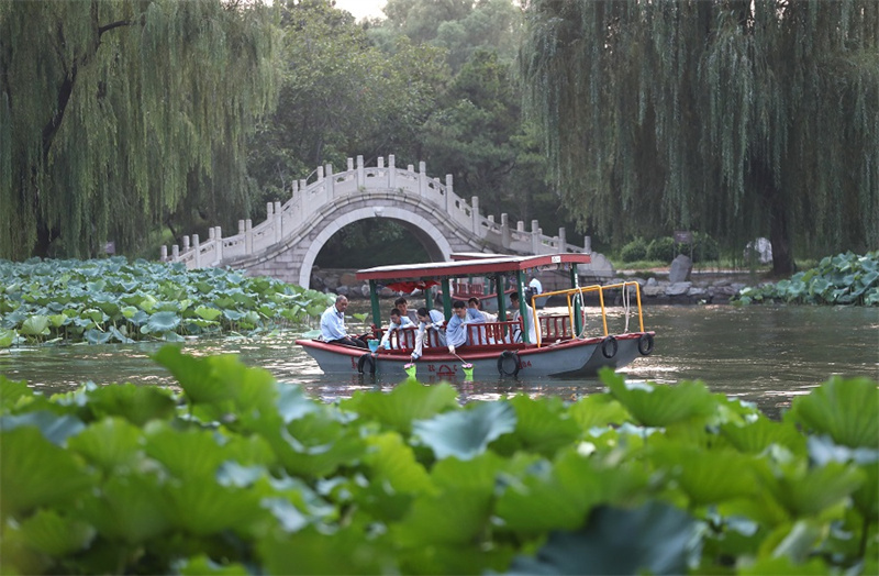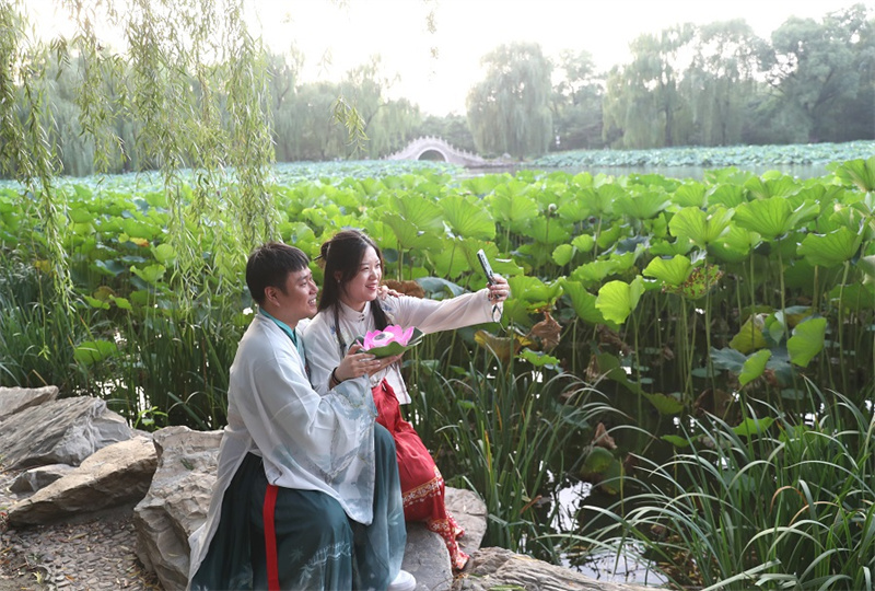 8月20日,身著漢服的游客手拿荷燈合影。中國(guó)日?qǐng)?bào)記者 鄒紅 攝