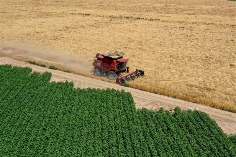 新疆呼圖壁縣五工臺(tái)鎮(zhèn)小泉村,農(nóng)機(jī)手駕駛聯(lián)合收割機(jī)收割小麥。新華社記者丁磊 攝