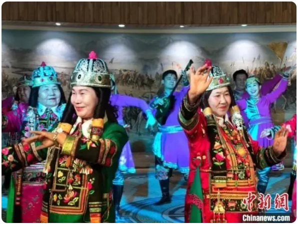 在博湖縣蒙古族非遺傳承保護(hù)中心,民間藝人們身穿華麗的民族服飾,伴隨著歡快的音樂(lè),抖肩、彎腰、翻掌,表演薩吾爾登舞蹈。(中新網(wǎng)記者 王小軍 攝)