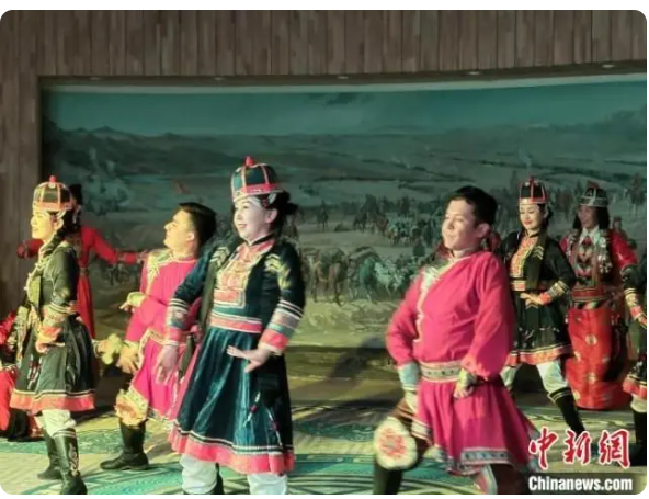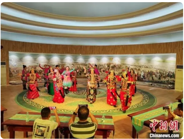 在博湖縣蒙古族非遺傳承保護(hù)中心,民間藝人們身穿華麗的民族服飾,伴隨著歡快的音樂(lè),抖肩、彎腰、翻掌,表演薩吾爾登舞蹈,惟妙惟肖的舞姿、歡快強(qiáng)勁的節(jié)奏,為現(xiàn)場(chǎng)觀眾帶來(lái)了一場(chǎng)精彩絕倫的視覺(jué)盛宴。