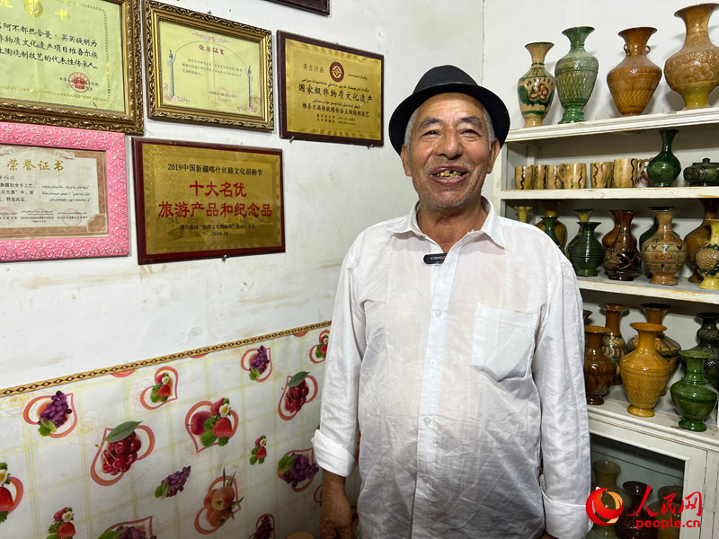國(guó)家級(jí)非物質(zhì)文化遺產(chǎn)模制法土陶燒制技藝傳承人阿卜杜熱合曼·麥麥提敏為記者介紹他獲得的榮譽(yù)。人民網(wǎng)記者 常雪梅攝
