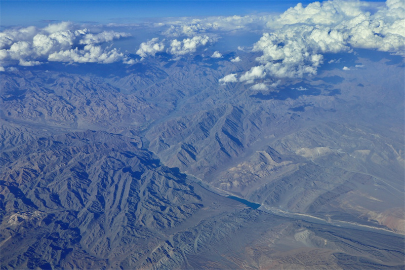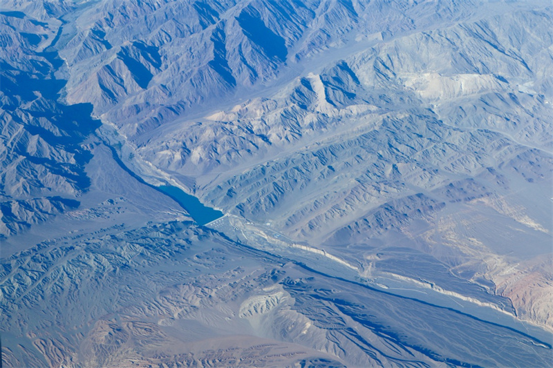 從飛機(jī)上拍攝的位于新疆博格達(dá)山南麓的吐魯番市大河沿河及大河沿水庫。(中國(guó)日?qǐng)?bào)記者朱立新 攝)