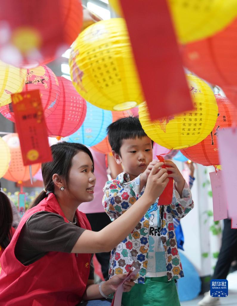 9月26日,在重慶市北碚區(qū)澄江鎮(zhèn)新時代文明實(shí)踐站,志愿者和小朋友一起猜燈謎。
